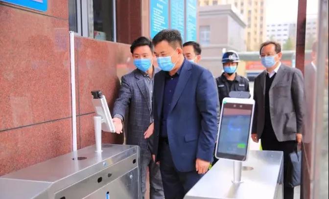 督查小組在視察入校體溫檢測點后,了解到智能測溫設備可通過在相關區(qū)域出入口部署人體測溫閘機,實現(xiàn)體溫篩查與人臉識別雙重認證通行,最大可能避免外來人員進入先關區(qū)域,確保在疫情期間既不疏于疫情防控,也不漏學生安全防護。技術人員為陜西省教育廳副廳長王紫貴介紹智能體溫測量系統(tǒng)